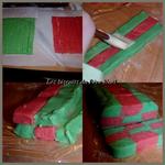 Disposez 3 bandes de pâte sur le plan de travail en alternant les couleurs (par exemple, 1 bande rose entre 2 bandes vertes). Badigeonnez d'oeuf battu le dessus et les interstices afin de coller les bandes de pâtes en les pressant délicatement. Posez par-dessus cette première couche 3 autres bandes de pâte en inversant cette fois les couleurs. Coller à l'oeuf battu et finir avec une troisième couche. Enveloppez le boudin de pâte obtenu dans le film étirable en serrant un peu pour maintenir le tout. Placez au réfrigérateur 30 minutes.