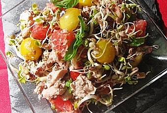 Une petite salade vite faite pour mon repas de ce midi,avec des graines germées,que je teste depuis un moment, mes premières salades n'étaient pas fameuses, donc j'avais laissé un peu tomber, mais l'association des saveurs nous a enchante mon fils et moi ce midi (et oui il m' en a piqué une part)
