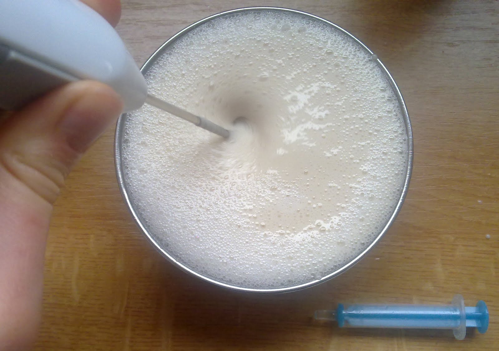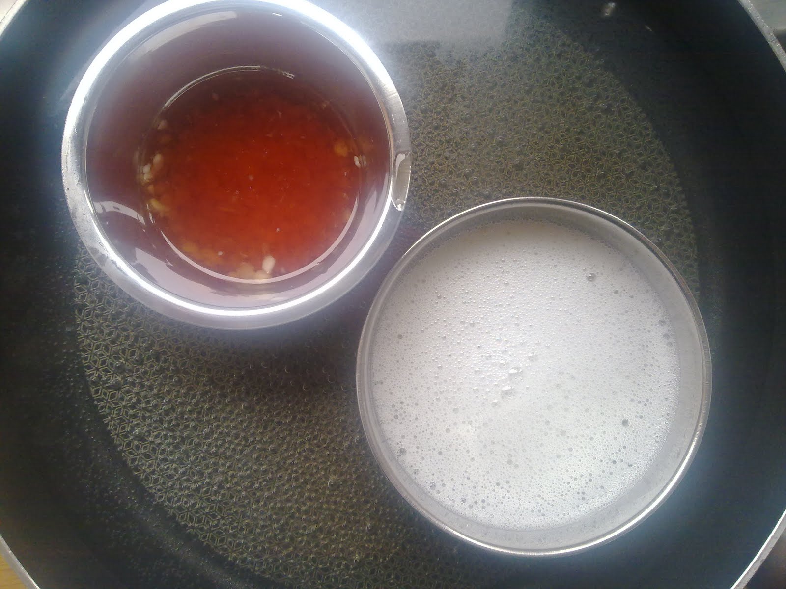 6/ Etape 2 de l'émulsion : afin d'accélérer l'émulsion, j'agite mon mélange encore 3 minutes mais dans un plat rempli d'eau bien froide. D'ailleurs la texture change...