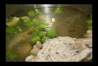 Retirer la carcasse, les abattis, les légumes à l'aide d'un écumoir.