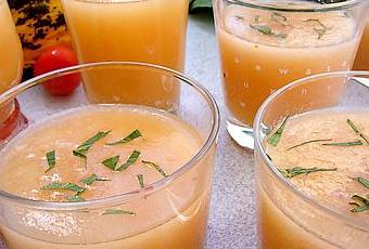 J'aurai pu publier cette soupe d'été sur mon blog salé Du sel dans ma cuisine puisque je l'ai servi en entrée avant cette terrine un soir ou il n'y avait pas un soufle d'air...mais on peut aussi la boire comme un smoothie en plein aprés-midi. J 'ai trouvé l'idée chez Les notes bleues d'une gourmande. La réalisation est enfantine et très rapide.