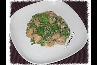 Ramener à feu doux et laisser cuire ainsi encore 5 bonnes minutes et ajouter une cuillère à café de miel, 8 cl de crème fraîche, quelques feuilles de coriandre et enfin les petits pois. Mélanger délicatement et laisser mijoter 3 minutes.