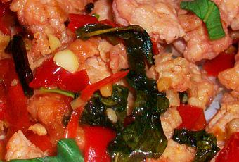 Faire chauffer un wok ou une poêle épaisse à feu moyen-fort, puis lorsqu’elle est très chaude, ajouter les lanières de poivron, et faire sauter pendant 2 mn, puis l’huile, l’ail et les piments, et faire sauter encore 1 à 2 mn.