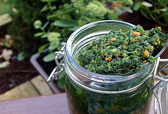 - Il est simple à mettre en œuvre, puisqu'on broie tous les composants et qu'on y ajoute simplement du sel (environ 1 volume de sel pour 4 volumes d'herbes hachées).