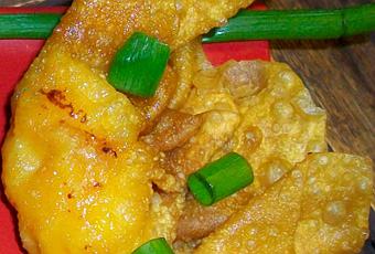 Déposer une cuillère à café de farce sur chaque feuille won ton, badigeonner autour de la farce avec un peu d’œuf battu, puis