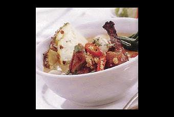 - Découper le canard en morceaux. Dégraisser le jus de cuisson et l'ajouter à la sauce au lait de coco avec les haricots verts égouttés.