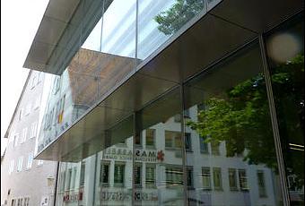 Sur la place devant la cathédrale une fontaine baroque et en arrière plan l'office du tourisme, encore une architecture moderne et épurée.