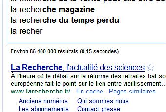 La rapidité de recherche des résultats est assez étonnante, bien sûr pour les internautes possédant une connexion bas débit, cette puissance ne pourra être aperçue. Voici un exemple lors de la requête provisoire La recher: