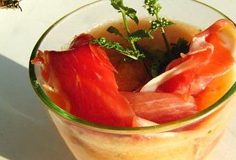 2. Dans le bol du mixeur mettre les dés de melon avec la menthe et le basilic. Mixer le tout. Ajouter un peu d’eau au besoin.