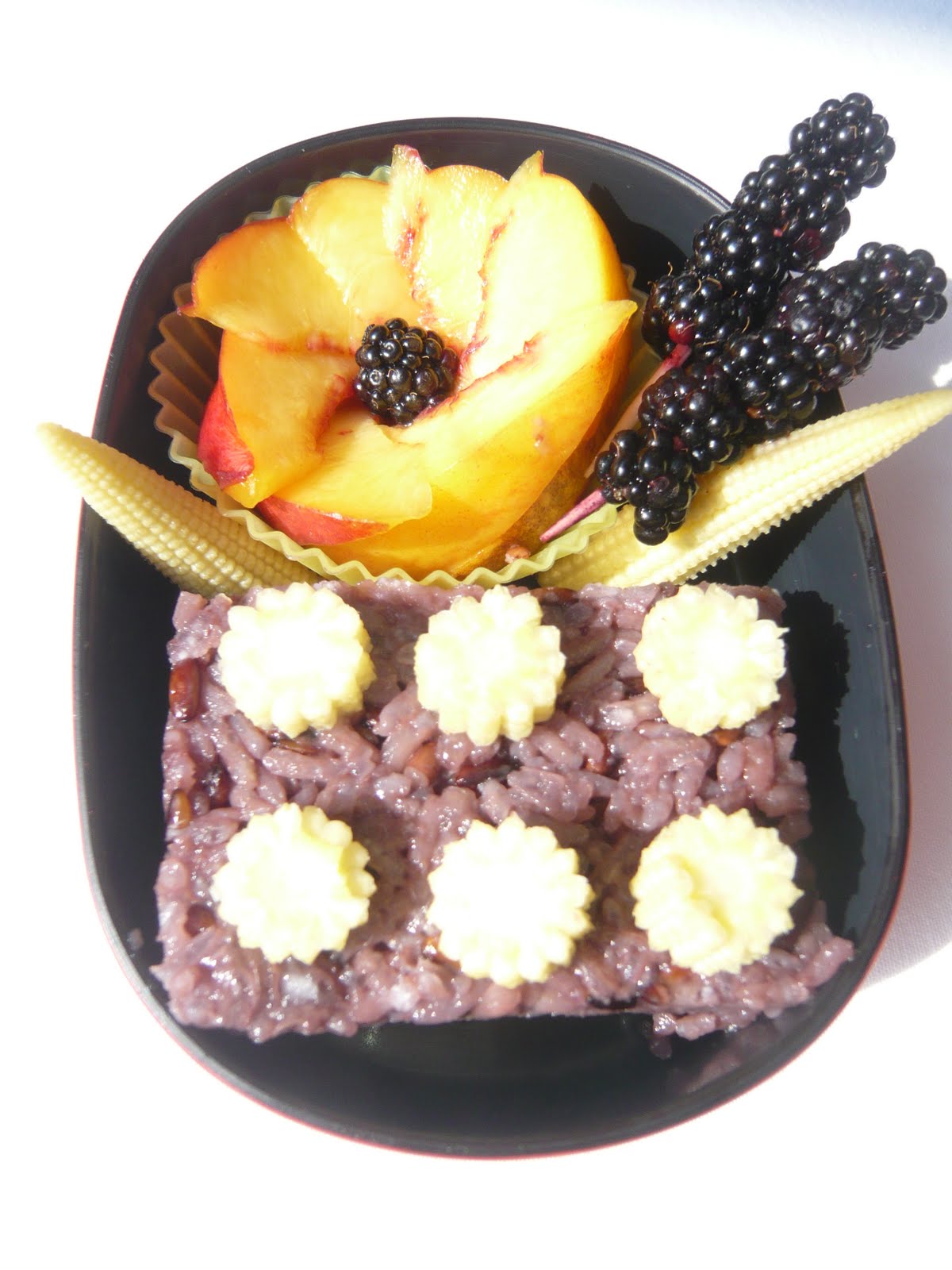 Cup de pêche jaune, mûres, mini maïs vapeur, riz violet avec des tronçons de mini maïs.