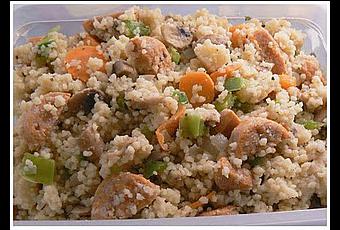 Piquer les saucisses et faire blanchir 5 minutes. Dans un poêlon, faire cuire les saucisses. Couper en rondelles ou en dés et réserver. Dans une casserole, porter à ébullition 750 ml (3 tasses) de bouillon de poulet. Retirer du feu, incorporer la semoule de blé et laisser gonfler 2 minutes Sur feu doux, faire cuire 3-5 minutes en remuant. Bien mélanger et défaire le couscous à l’aide d’une fourchette; réserver.