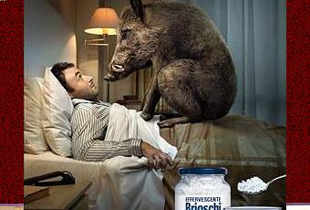 La pub du jour joue sur deux ressorts : l'exagération avec un sanglier sur le ventre d'un personnage, et d'un autre côté l'image comique qui dédramatise la situation tout en éduquant...