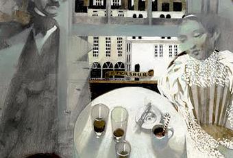 Peinture de Sterling Hundley appelée La lune de miel de Poe. Admirez le camaïeu de gris et de vert (bronze rouillé ?) et l’effacement (comme programmé) des personnages. La fête est pleine de solennité mais dénuée de toute joie. Les personnages sont entourés de portraits (de défunts ?), l’extérieur est rayé de barreaux. Les poumons fragiles de Virginia laissent voir les barreaux de la chaise : jamais une cage thoracique n’aura aussi bien porté son nom… L’heure est déjà grave.