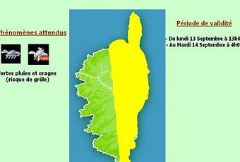 Les orages touchent les Massifs en début d'après-midi, ils sont ponctuellement forts et porteurs de grêle.. En milieu d'après-midi, ces orages débordent sur la région Bastiaise et le Fiumorbu. Au fil des heures, ces pluies peuvent se renforcer et prendre un caractère orageux. Un risque de petite chutes de grêle est également présent. Le vent de Nord se lève sur la Balagne et la Façade Occidentale, il atteint 40 à 50km/h.