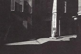 Un bon nombre de ses photographies urbaines ont aussi cette touche, qu’il s’attache aux signes au sol, ligne blanche sur le bitume au milieu de la chaussée ou éclat de lumière entre les masses noires des immeubles (là encore, Bob Fine, 1952, est quasiment impossible à reproduire, d’un noir trop intense fendu par un trait lumineux); il y a enfin ici deux
