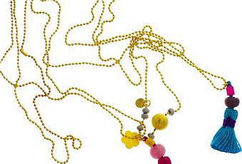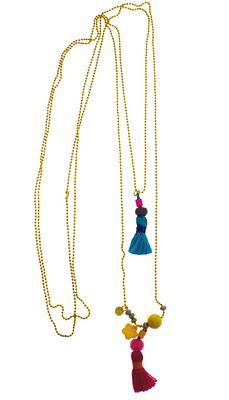 Sautoir "Pompons colorés" composé de deux pompons textile magenta eu bleu, de perles en verre et petites perles en plastique, de breloques diverses en laiton et nacre. Chaîne à billes fines en laiton doré. Très longue pour pouvoir faire un tour autour du cou et ajuster le collier à sa convenance.