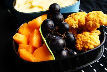 Dans le premier compartiment, du melon en entrée, du chou fleur orange à tremper cru dans la mayo (c'est trop bon) et quelques grains de raisin.