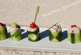 Pelez et coupez le concombre dans le sens de la longueur. Creusez le centre du concombre pour enlever les pépins. Garnissez les deux moitiés de concombre avec la préparation au thon. Mettez le tout au frigo pendant une ou deux heures et coupez en morceaux réguliers avec un couteau bien tranchant. Décorez à votre goût. Servez bien frais.