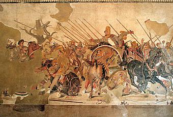 Mosaïque de la bataille d'Issos, IIe av. J.-C.maison du Faune à Pompéi, Musée archéologique national de NaplesIl est un empereur nomade qui eut pour précepteur un grand philosophe. Aristote voit s’éloigner au loin la stature équestre de son élève Alexandre le Grand. Avec fougue, Alexandre et son cheval Bucéphale partent à la conquête du monde conquérir des terres sur l’inconnu. Ils disparaissent à l’horizon. Mais à la courbure de la Terre qui voit-on réapparaître ? D’un mirage, d’une brume de chaleur se détachant de l’horizon, surgit sur sa monture un chevalier à la triste figure, “sec de corps et maigre de visage”. Alexandre et Bucéphale méconnaissables réapparaissent déguisés en Don Quichotte et Rossinante. La désillusion est grande. L’épopée est devenue picaresque et le mythe celui d’un aventurier à la dérive, digne ou fripouille, hagard, vagabond ou mythomane.