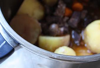 Faire revenir les lardons dans le beurre et l'huile, ajouter les échalotes et la viande, puis, une fois que la viande est prise, ajouter l'ail, les carottes en rondelles, les champignons entiers les pommes de terre coupées en deux, la farine, le vin et le persil. Fermer la cocotte et programmer 30 minutes après le sifflement (la mienne a une alarme intégrée, c'est ultra pratique).