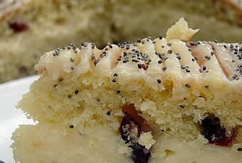 Préchauffer le four à 200°C. Préparer le gâteau en battant les œufs avec le sucre et en ajoutant successivement, en mélangeant, la crème, le beurre, les amandes, la farine tamisée avec la poudre à pâte et le bicarbonate. Terminer par les graines de pavot et les canneberges.