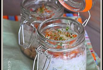 - Répartir l'émietté de saumon dans le fond des bocaux puis le tzatziki. Déposer le saumon fumé découpé en lanières puis décorer de graines germées.