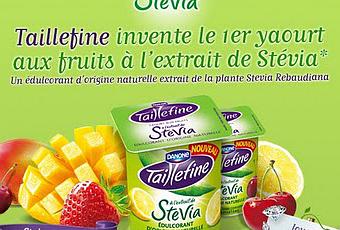 La stévia, kesako ? La stévia rebaudiana est une plante originaire d'Amérique latine. Les Indiens guaranis l'utilisent pour adoucir les infusions. Elle a la particularité d'avoir un fort pouvoir sucrant (30 à 45 fois supérieur au sucre dixit WikiChéri), tout en ne modifiant pas le taux de glucose sanguin. Des extraits de stévia sont utilisés comme édulcorants depuis les années 1970 au Japon, en particulier dans les sodas. Ils sont également autourisés depuis peu aux Etats-Unis, où Coca Cola et PepsiCo sont sur les rangs. La feuille de stévia en tant que telle n'est pas autorisée pour la vente alimentaire chez nous.En terme de pack, c'est le pot des yaourts aux fruits de Taillefine mais rhabillé de vert tout en transparence, avec un effet lumineux et une feuille de stévia stylisée en front. L'effet est sobre et doux. Le pack se détache bien, marque sa nouveauté tout en s'intégrant parfaitement à la gamme. La vert joue bien avec le violet du logo Taillefine. La typo cursive un air de famille avec celle de Taillefine, avec ce côté élancé, moins ronde que pour Jardins Gourmands, moins enfantine que celle des yaourts aux fruits. Les fruits sont mis en avant pour apporter du plaisir (et contrecarrer un peu tout ce vert pas toujours très gourmand).