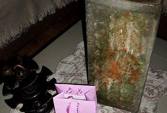 Elle n'est pas venue les mains vides, elle m'a apporté un porte-tampons qu'elle avait chiné elle-même, deux de ces petites créations-textiles, çà sent trop bon la lavande, et pour mon Croûton, un vieux bidon.
