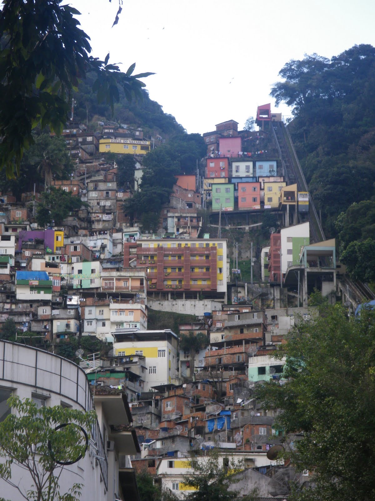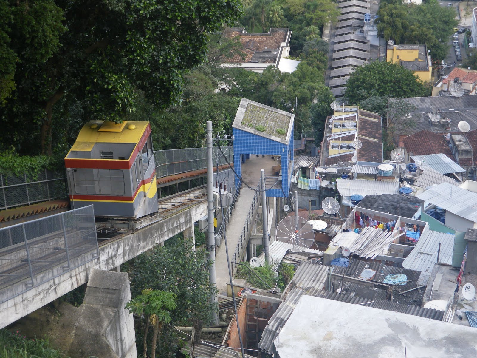 Nous rejoignons Tatiana (pas ma maman, non !), la guide-géographe qui assiste Anne-Marie dans sa découverte des lieux, puis nous arrivons au pied de la favela. Le calme règne, l'atmosphère est bon enfant, et nous avançons très naturellement jusqu'au pied du funiculaire de Dona Marta : inauguré en 2006 dans le cadre de l'opération "Favela Bairro", il permet aux habitants de rejoindre leurs quartiers respectifs sans trop souffrir de la déclivité des lieux. Nous l'empruntons au milieu des enfants qui rentrent de l'école, et nous en descendons en son premier arrêt (il compte au total quatre tronçons).