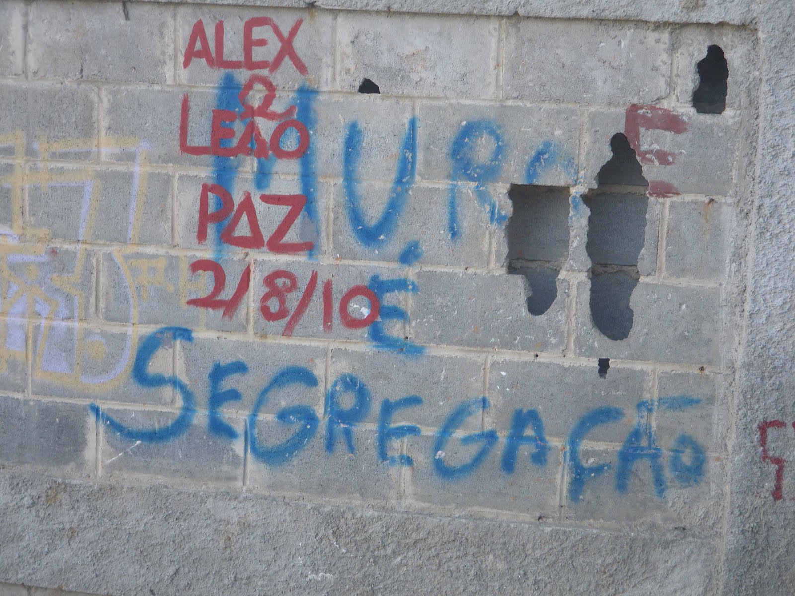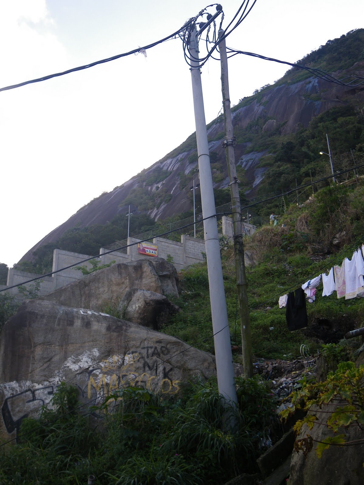 Nous commençons à nous enfoncer dans Dona Marta, via la Rua da Matriz (la favela dispose de ses propres noms de rues, dont les affichettes ont été "sponsorisées" par la compagnie d'électricité), en traversant celle-ci d'est en ouest afin de nous approcher du fameux "mur de la honte". Plusieurs enfants gambadent dans les rues ou jouent de la "pipa" (les cerfs-volants), et nous ne ressentons aucune tension particulière ni aucune agressivité de la part des gens, comme si au fond la balade par des "étrangers" dans la favela pacifiée (Dona Marta a été la première des favelas de Rio à accueillir une fameuse UPP - Unité de Police Pacificatrice, j'en avais également déjà parlé ici et j'y reviendrai un peu plus loin) était devenue une activité naturelle, acceptée par tous.Nous parvenons finalement aux abords du mur, non sans avoir devisé avec quelques habitants qui préparent, en ce vendredi après-midi, la "festa agostina" (fête d'août) de la communauté, qui aura lieu tous les week-ends de ce mois-ci. Ceux-ci sont globalement souriants et accueillants, et nous expliquent, à propos du mur, que celui-ci est très mal accepté par tous, qui y voient une tentative d'enfermement, voire de ségrégation (l'expression est d'ailleurs tagguée sur l'un des pans du mur...cf ci-dessous) de la part du gouvernement (de l'Etat de Rio), dans une logique d'opposition et de division (le verbe "dividir" employé par plusieurs habitants) des classes riches et de la population favelada. Tous considèrent que l'argument "préservation de la nature" ne tient pas la route, et il faut avouer que l'on voit mal la favela s'étendre encore à l'ouest, puisque l'on est à flanc de rochers...