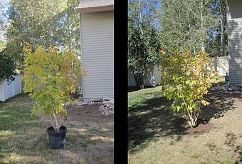 En bons consommateurs, nous avons posé tes tas de questions et notre choix s'est finalement porté sur un acer grandidentatum, une espèce d'érable natif de notre région, communément appelé « Big Tooth Maple » qui se trouvait juste à l'entrée de la pépinière et dont le feuillage commençait déjà de changer avec plein de reflets dorés. Nous avons donc réglé l'érable et sommes revenus le lendemain avec notre remorque pour le charger et le ramener à la maison. Hier était le jour choisi pour planter notre nouvelle acquisition et après l'avoir bien situé, j'ai creusé un grand trou (pour une fois j'ai tout fait dans les règles de l'art,) j'ai bien centré les racines et j'ai rempli l'espace vide avec de l'humus vieilli à la maison et voilà! Nous avons maintenant un remplacement pour ce genévrier que nous avons placé assez loin de la maison pour qu'il ne pousse pas dans le toit!
