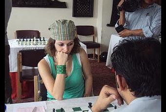 Nous sommes à la 8ème ronde, et notre amie Nino Maisuradze (GMF, 2273 Elo) affronte le maître Fide Népalais Manish Hamal (2057) sous-classé par rapport à son niveau réel. Ambiance Roland Garros, Nino entre sur le court avec un bandeau sur la tête comme une tennisman déchaînée. Coup droit dévatateur Txf2! puis revers victorieux Txb2!, réservez vos places !