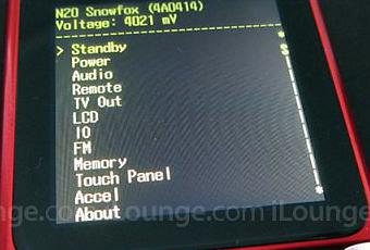 Pour ce faire, il faudra redémarrer son baladeur en maintenant le bouton d’extinction et de volume jusqu’à ce que le logo d’Apple apparaisse à l’écran, puis maintenir enfoncés ses trois boutons physiques. au bout de quelques secondes devrait apparaitre le message « iTerm : iPod Diplay Console ». On pourra alors naviguer dans les menus à l’aide des boutons dédiés au volume. Au sein de ce mode diagnostic, l’iPod Nano 6G est identifié sous la référence « N20 Snowfox » alors que la génération précédente était surnommée « N33 GreatDane ».