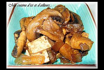 300 gr de tofu 250 gr de champignons de Paris 2 oignons 1 gousse d'ail 1 cuillère à café de gingembre en poudre 3 cuillères à soupe d'huile 1 cuillère à soupe d'huile de sésame 1 cuillère à soupe de vin de riz 2 cuillères à soupe de sauce soja Poivre