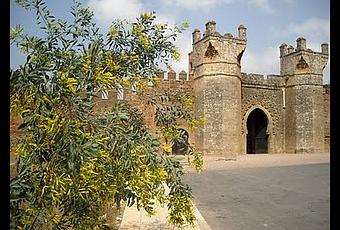 Le site de Chellah serait un des premiers postes à avoir été occupé dans la région de l'actuelle capitale du Maroc, Rabat. On y retrouve en effet des ruines romaines datant de 200 av. J-C. Par contre, l'essentiel du site tel qu'on peut le voir aujourd'hui est composé de constructions du 14e siècle, alors que le sultan Abou el Hassan poursuivait la tradition almohade de faire du site le lieu de sépulture de la famille royale. Le sultan y repose d'ailleurs toujours.Chellah est situé en retrait de la Ville Nouvelle de Rabat. On y accède en traversant la porte Bab Zaer et un large boulevard contemporain. Le vieux poste romain et le site funéraire sont compris à l'intérieur d'une forteresse munie d'une porte monumentale merenide et de tours à créneaux. L'effet est saisissant, et presque gothique, en particulier les bastions octogonaux qui supportent pourtant des tours carrées.