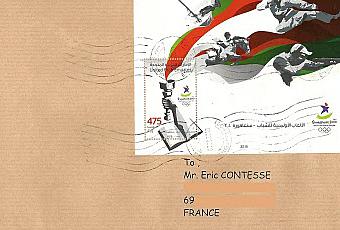 The upper margin of this sheet is evoking the colors (red, black, white, green) of UAE's flag and the four sports in which the four young Emirati athletes competed at these games : equestrian, sailing, taekwondo and shooting.