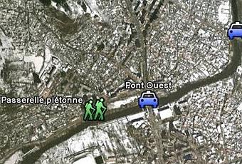 La passerelle la plus connue (passerelle piétonne dite "Tancarville" sur les cartes de la KFOR) est une infrastructure construite par les militaires français (voir des photographies de la construction de la passerelle sur le site Novo Selo) afin de permettre aux Albanais vivant dans les Trois Tours de rejoindre, à pied, le Sud de la ville, principalement pour aller travailler et commercer. Les Trois Tours sont trois immeubles identiques qui formaient avant le déclenchement de la guerre un des rares lieux réellement multiculturel de Mitrovica, et même du Kosovo : à l'intérieur des tours, Serbes, Albanais, et petites minorités se côtoyaient. Mais avec la guerre, ces trois bâtiments se sont fortement homogénéisés, les Albanais et les petites minorités se regroupant dans deux tours, tandis que les Serbes s'installaient dans la dernière tour ou s'éloignaient de ce micro-quartier (voir le schéma illustrant les processus d'homogénéisation extrême des espaces de vie pendant la guerre du Kosovo). Les Trois Tours se trouvent à proximité du pont ouest (voir le schéma du centre de Mitrovica), pourtant il est dangereux pour les Albanais des Trois Tours de se rendre sur la rive sud par ce pont, puisqu'ils doivent transiter par les zones d'habitation serbe, et surtout passer à proximité des" Gardiens du pont", "des Serbes radicaux, recrutés comme supplétifs de la Kfor en 2000, mais qui se sont investis ensuite d'une compétence occulte de contrôle du Nord de la ville, en commençant par l'accès au pont [...], l'un des avatars des "structures parallèles" qui administrent le Nord et dont la communauté internationale voudrait bien se débarasser, sans encore oser en prendre les moyens" (lire Jacques Aben, "Une géographie politique de Mitrovitsa", Défense nationale, n°2/2003, février 2003, pp. 99-109). Depuis sa contruction, la structure de la passerelle a été renforcée, marquant la nécessité de sa nécessité de maintenir ce lieu d'échange pour décloisonner les Albanais des Trois Tours, ce qui témoigne de l'échec de la reconstruction du pont ouest, non en tant qu'infrastructure, mais en tant que géosymbole de la réconciliation. Aujourd'hui, la passerelle est devenue un point de passage privilégié pour les Roms de Mitrovica, entre leurs deux espaces de vie : "Ostérode" (ancienne base de l'Armée yougoslave, qui a été reprise par la KFOR au moment du déploiement de la force internationale, et sert, depuis le début du processus de désengagement des troupes à l'intérieur de la ville de Mitrovica, de camp de déplacés aux Roms) et Roma Mahala (le quartier rom, en partie reconstruit par la communauté internationale depuis 2008).