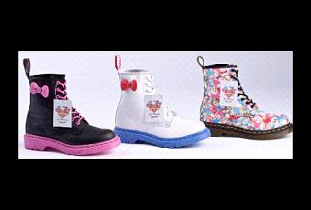 Un modèle de bottines « 1460 » dont l’imprimé rassemble les personnages Sanrio alors que les autres modèles (au nombre de quatre) rendent hommage aux plus célèbres d’entre eux, Hello Kitty.