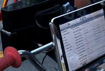La première photo est un bidouillage maison permettant de fixer un iPad sur le guidon. Celui-ci est relié à un haut parleur.