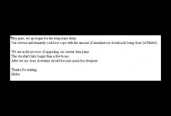 Le nouveau site proposant du téléchargment de musique sur internet, mulve.com, et visant à remplacer à la fois Napster, les BitTorrents, e-mule, e-donkeys et autre peer-to-peer est encore victime de son succès et propose un laconique message à ses utilisateurs, expliquant que la charge a fait exploser les serveurs (il devrait être remis en oeuvre dans quelques heures, et renforcé).