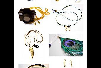 Badge "It rocks" (5 euros), collier "roudoudou, dit l'endimanché" (35 €), collier "Mini appareil photo" (29 €), bracelet gri-gri oiseau (10 €), collier "aile d'ange homme " (30 €), collier "Tendre plume de paon (26,50 €), serre-têtes "Miss prune" et "Miss green" (25 €), boucles d'oreilles "Les élégantes, plumes " (17 €).