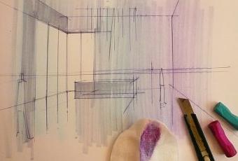 Le dessin de base est réalisé au stylo à bille. Puis l’ambiance lumineuse est rapidement rendu par l’utilisation d’un feutre gris clair en laissant en réserve les baies vitrées. L’atsmophère colorée du lieu est rendu à la poudre de pastels sec passé au coton.