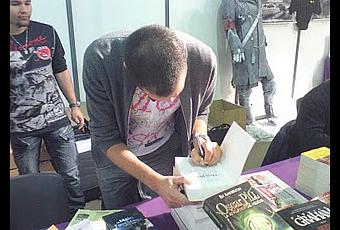 Mais...plus de lecteurs que d'auteurs à ce moment là ! J'avais ma liste des auteurs que je voulais aller voir, alors j'en ai profité pour repérer la place de chacun, puis avec mes fistons on va s'installer devant le stand d'Eli Anderson, histoire d'être les preum's avant le grand rush qu'il allait sûrement subir.Il arrive et je lui tends mon livre. Il le feuillette, voit mon nom et me demande " Vous l'avez acheté pour vous, pas pour vos garçons ?"...sur le cul le monsieur! " Ben oui, mais ils ont eu le droit de les lire hein...après moi!"...il éclate de rire." Bon alors je fais la dédicace à votre prénom alors?"" Ah non, non, à Dup !" et là, ses yeux s'éclairent, il se lève et me tape la bise ! Bon, faut que je vous avoue qu'Eli, je l'avais rencontré déjà plusieurs fois à l'époqueoù il s'appelait Thierry Serfaty car j'étais fan de ses thrillers médicaux...on est mêmeallé boire un pot ensemble à Saint-Etienne en compagnie de Patrick Graham, Daniel Angélo et quelques copinautes...Donc on a discuté pendant un sacré bon moment. Trop sympa le monsieur ! J'annonce de suite une interview très prochainement sur notre blog...Mon fils prend une photo pendant qu'il me dédicacemon Oscar Pill