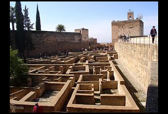 L’Alhambra de Grenade est une citadelle composée de différents éléments architecturaux. L’alcazaba serait la partie la plus ancienne, datée du IXe siècle. Cette forteresse aurait principalement servi à accueillir les militaires. Les tours des Armes et du Guet offrait à ceux-ci une vue imprenable sur les éventuels assaillants.