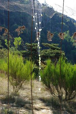 un lac... avec le dessus /dessous... un cratère... -volière avec oiseaux -Quand les matériaux font leur retour aux sources -des pendus à un filet avec un caillou, au milieu des diamants verts -filet de pêche (2 fois) -filet à poissons volants ou attrape rêve -un filet à papillon, un mobile pour bébé -ça fait penser à une montgolfière (7 ans) -manège, gouttes d'eau -HLM diadème pour épeires campagnardes urbanisées - ?? -monsieur dit que c'est un tamis à étoiles filantes...madame dit que c'est un panier à salade de mémé, et en s'approchant elle trouve ça absolument joli -retour au tamis -suspension, légèreté, micro-univers, lumières, micro-planètes-minérale -kiosque à musique où les cailloux dansent avec le vent, oiseaux imaginaires qui font leurs nids en pierre -ça fait bizarre , c'est rigolo, j'aime bien le truc vert au milieu -on ne sait pas tellement à quoi ressemble la 2ème œuvre. Il y aurait peut-être besoin de certaines explications -comme un attrape rêve géant pour piéger les gros cauchemars plein de monstres – comme des petits soleils qui dansent -expression de rite vaudou, terre sacrée, nid d'oiseau, atmosphère, mobile,champignon nucléaire, trampoline, lune, étoiles, éclore -on dirait un hamac, un filet à poisson -piège à con -cage d'air, de liberté, de légèreté -les racines du ciel -piège à qui ? Piège à quoi ? -Est-ce un filet de pêche? Je n'aime pas ce vert, il n'est pas naturel -toile d'araignée – petites sorcières et leurs balais !! -légèreté , liberté -la naissance l'enfermement (….) (….) perte de l'envol -nous pensons à une méduse à Tiranges -douce magie, arbre à pensées, à interrogations, cela me rassure -énergies de la (…) suspendues -grillage pour s'empêcher de s'élever ver l'éternité -néant – la nature et ses ailes -jeu de piste -rester assis sous les racines à écouter l'Ance couler!