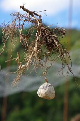 (Couteau : non du lieu) -méduse avec sensation de flottement ...prison sans barreaux, liberté légèreté -une méduse flottant entre 2 eaux -méduse au pays de Chalencon... méduse aérienne... -soucoupe volante (2 fois) -la « méduse » suggère la naissance de la vie dans un monde végétal et minéral -bruit d'eau ; méduse ? (je suis médusée) ...ou extra terrestre en voyage dans le pays -ça fait penser à une méduse et ses tentacules (9 ans) -méduse terrestre, méditation d'êtres extraterrestres, toile d'araignée -toile, où est la bête ? -de loin « toile d'araignée et sa rosée », de près »monument funéraire indien -mobile géant pour bébé géant... toile d'araignée, manège de racines enchantées, volière -où est la bête - une toile d'araignée et les proies, l'ouverture vers l'espace -légèreté et pesanteur faire danser les pierres au vent... le piège à rêve de l'araignée -prière dans le vent et que tombe la pluie -des formes qui volent sur le fond sombre des sapins,