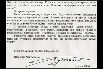 La semaine dernière, je titrais un de mes articles "Moscou vaut bien un lynchage" : après une semaine de vacances et un refus de s'en aller de lui-même, Dmitri Medvedev a décidé de limoger le maire de Moscou, Iouri Loujkov, pour perte de confiance. Les médias et les bloggeurs ont largement commenté cette décision aujourd'hui. Et celui qui a certainement la meilleure information sur cette affaire est The News Times, qui a obtenu une copie de la lettre que Loujkov a transmise au président Medvedev pour plaider sa cause (un morceau de la lettre en illustration). Mais critiquer le président en lui disant qu'il profane la démocratie en le limogeant n'était apparemment pas la bonne tactique pour lui faire changer de décision.