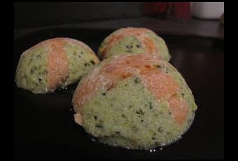 Tapissez les empreintes en silicone avec des lamelles de saumon fumé, et versez la mousse par dessus.