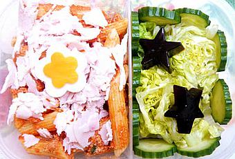 pâtes sauce tomate/feta/basilic avec des bouts de filet de dinde (je voulais faire des formes au début mais tout se barrait en lambeaux) et fleur de mimolette et gouda de chèvre
