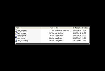 Pour compresser les images, il suffit de glisser/déposer les images dans le répertoire où se situe le binaire et de lancer le batch opti_png.bat. L’image de départ est alors écrasée (pensez à la sauvegarder auparavant).
